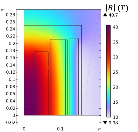 | Left: Central magnetic field of a 50 mm bore, 40 T hybrid CORC® solenoid operating at 11,000 A. Right: Central magnetic field of a 1.2 m bore, 20 T CORC® solenoid operating at 25,000 A. | |