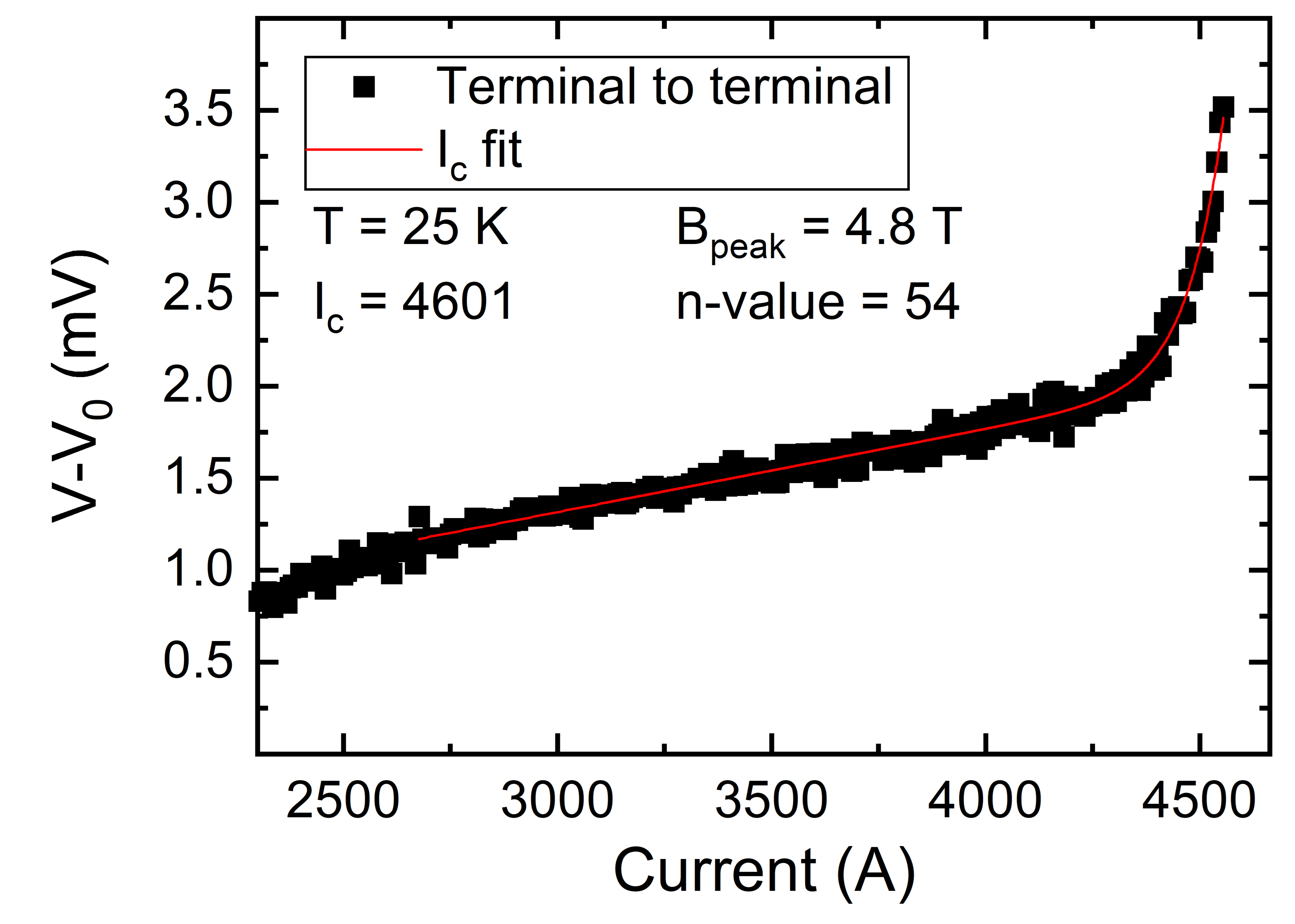 | Left: Stand-alone CORC® solenoid wound from a CORC® wire containing REBCO tapes with local dropouts. Right: Voltage as a function of current of the 70 mm bore solenoid at 25 K, generating a peak magnetic field of 4.8 T at 4,500 A. | |