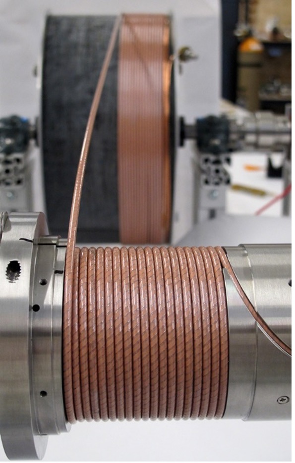 | Left: Cross-section of a series-connected pair of CORC® solenoids. Right: Winding of the CORC® insert solenoid in which three CORC® wires are operated in parallel. | |