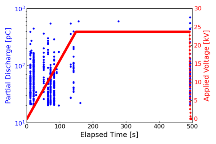 Partial discharge of a CORC® cable at 77 K under dc conditions. Initial discharge is due to switching noise during ramping. The cable remained discharge free at 24 kV.